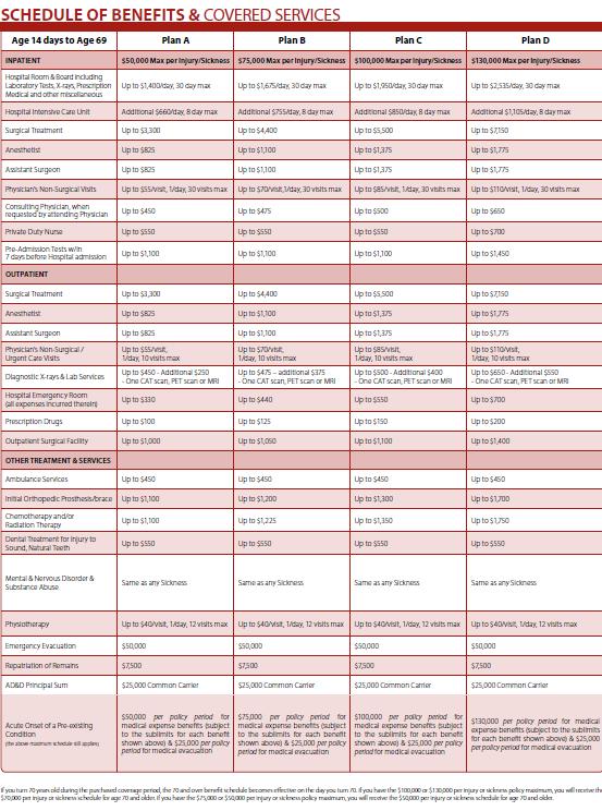 C, or D). Benefits will be provided for expenses incurred in the U.S., minus